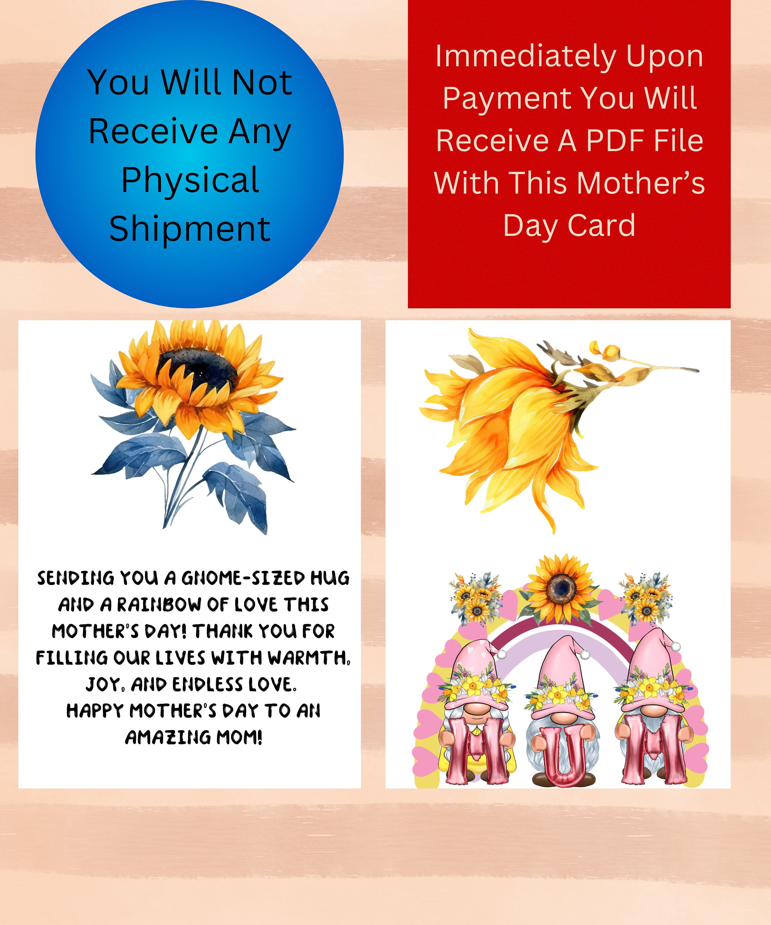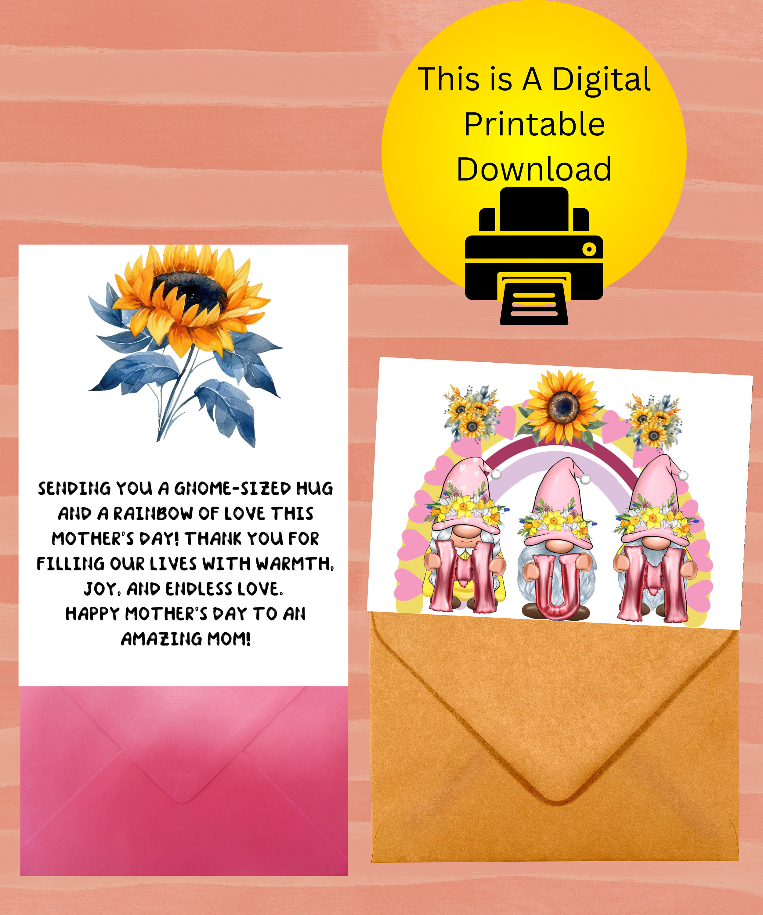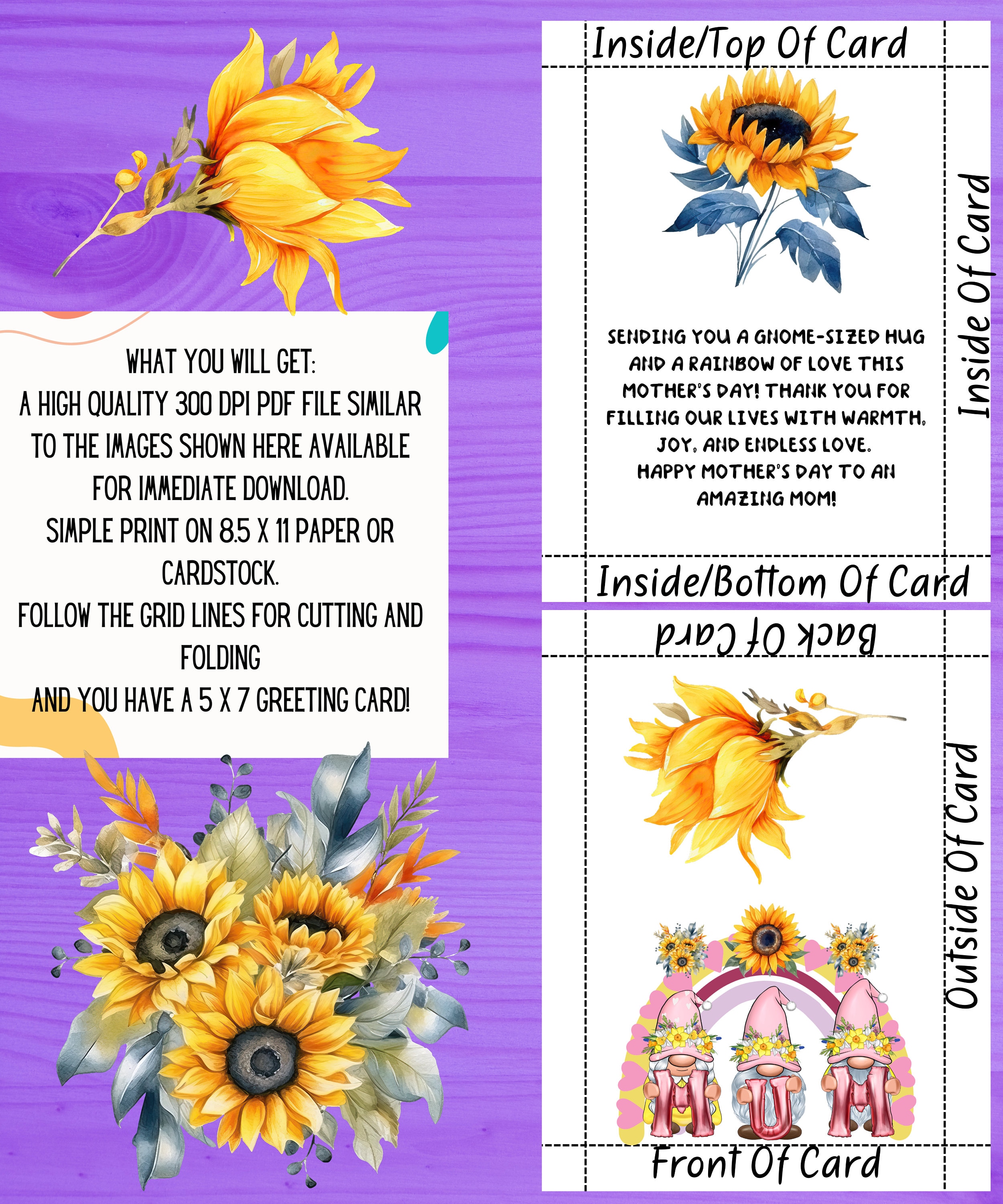 🌻Capture the whimsy and warmth of Scandinavian charm with this delightful Mother's Day card! Adorned with adorable gnomes, vibrant sunflowers, and a heartfelt message, this charming card is the perfect way to convey your love and appreciation to mom on her special day. Whether she's a fan of Nordic decor or simply adores cute and cheerful designs, this card is sure to bring a smile to her face. Share the joy of Mother's Day with our enchanting Scandinavian gnome-themed card today!